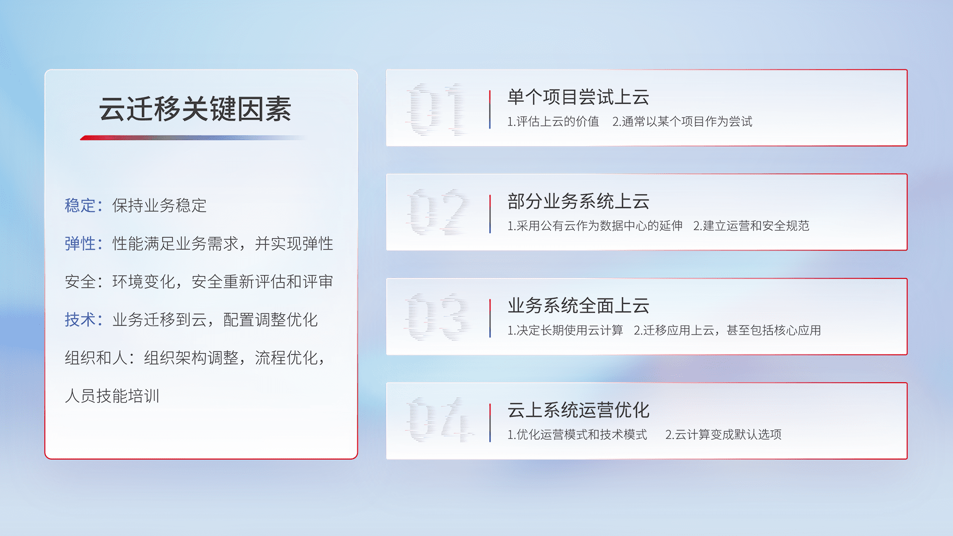 结合实际业务,,,,从规划设计、、云平台选型、、、云原生改造、、、数据迁移、、、集成交付,,迁移全过程为客户识别最佳上云路径,,做好风险识别管理,,,,设计网络架构、、、、身份权限、、安全审计合规、、、、操作审计、、、、日志审计、、、、监控告警策略、、多站点容灾设计等,,对云上基础设施进行整体规划,,,,提升IT治理水平,,,,以满足弹性、、、高可用、、高性能的需求。。。。