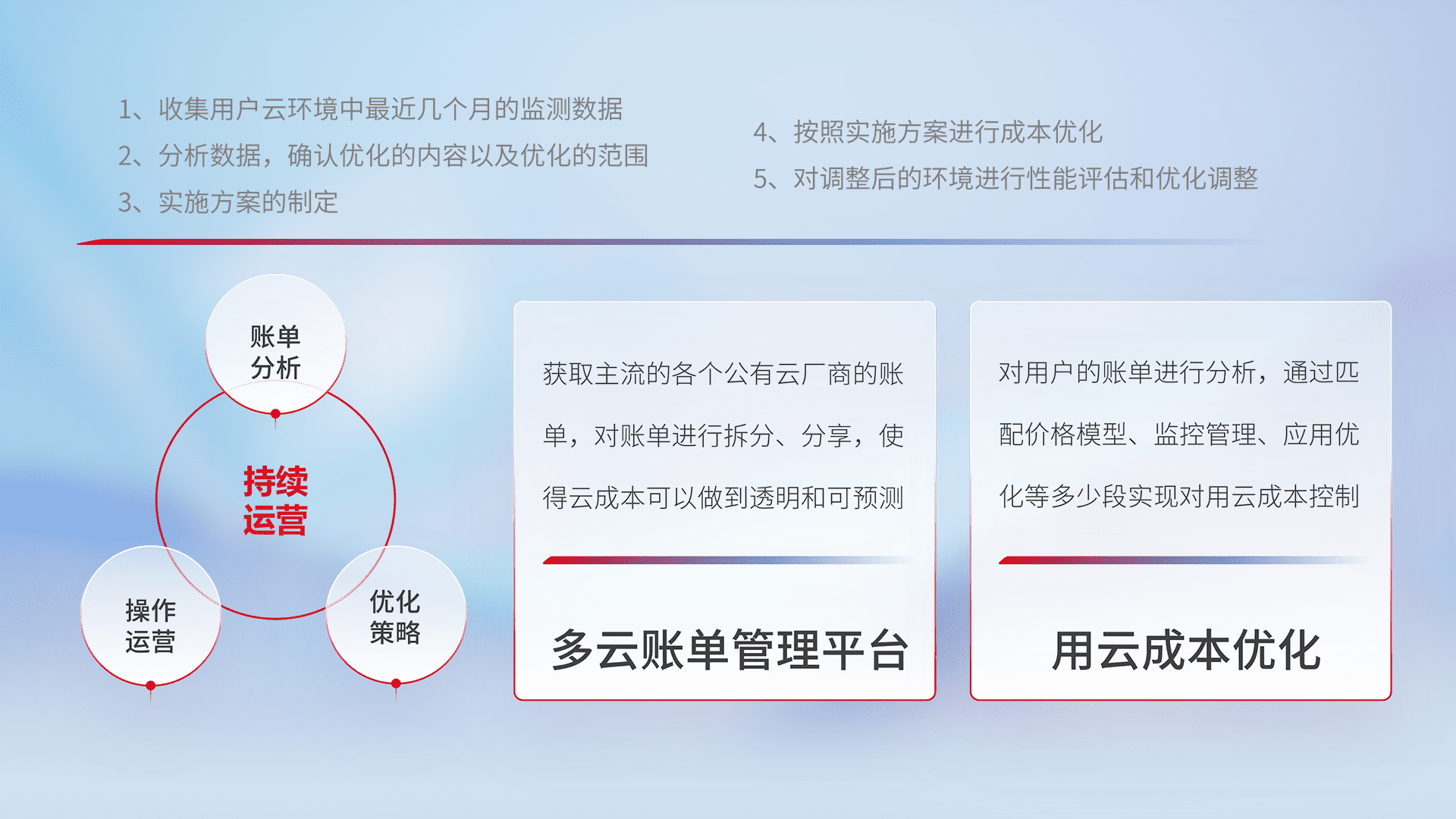 通过多云纳管,,以统一的资源数据模型把客户的云资源进行抽象和封装,,,进而实现对多云资源的统一操作,,,保障云资源管理的可靠性、、、、稳定性与可用性。。量身定制化运维内容,,,配置、、开发运维、、补丁管理、、、备份、、、监控、、、认证和访问管理、、、、审计和日常巡检等,,保障在用云过程中的可靠度,,,,稳定度以及高可用率。。。